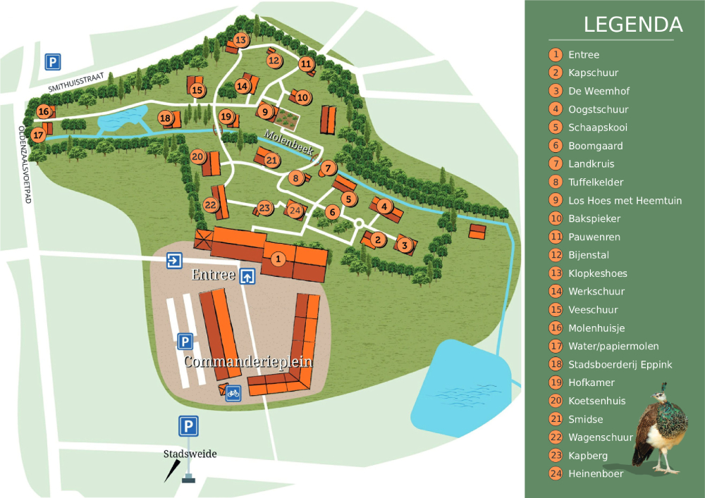 Hieronder vindt u de plattegrond van het Openlucht Museum. Door met uw muis over de nummers te gaan, krijgt u meer informatie over het betreffende gebouw. Op mobiele apparaten kunt u het nummer aanklikken voor extra info.